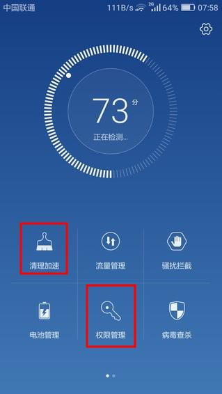6、步骤二:返回“手机管家”首页,然后点击“权限管理”